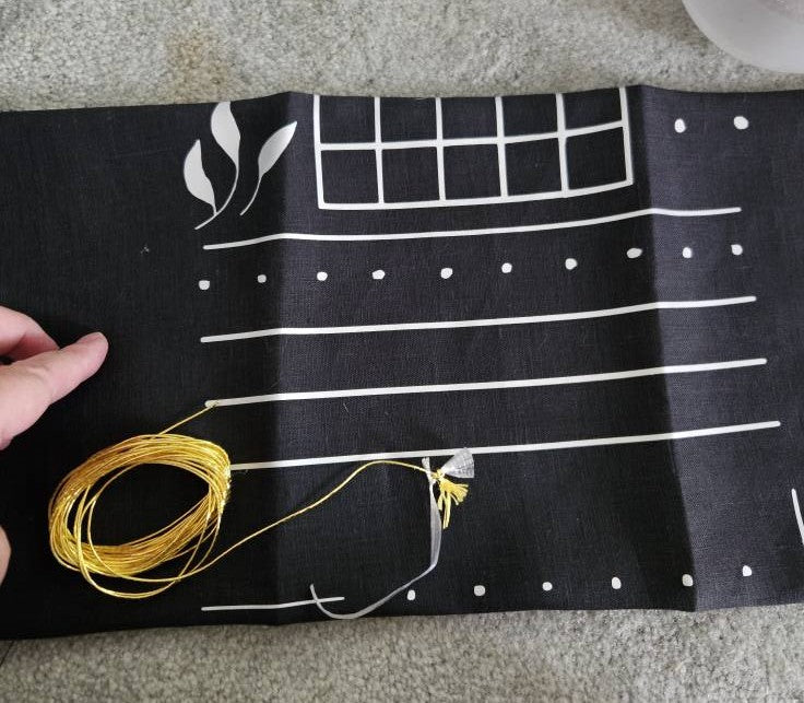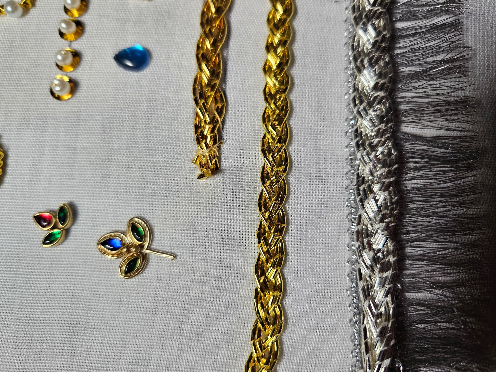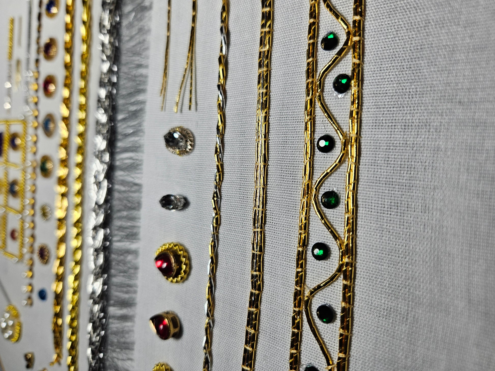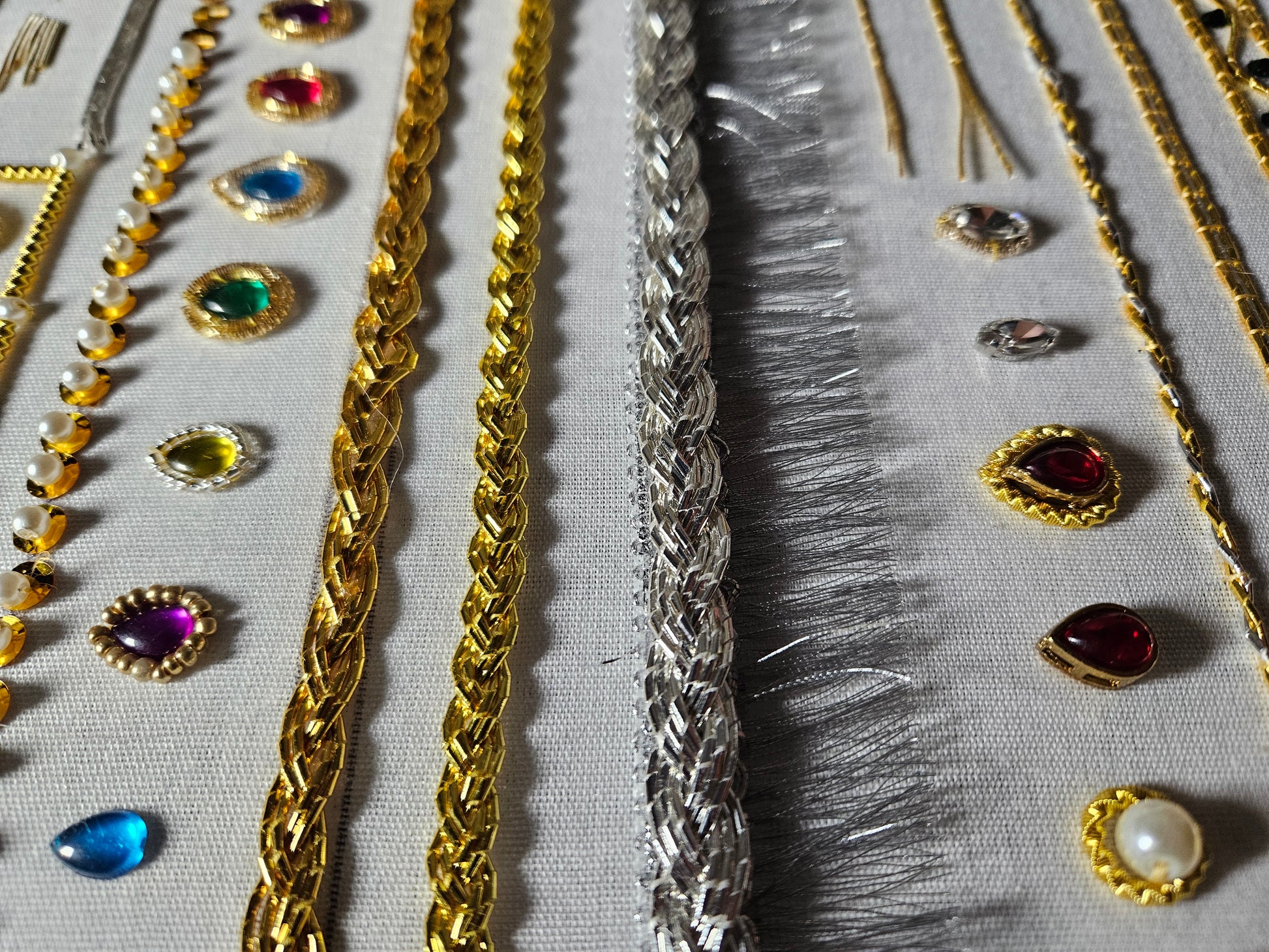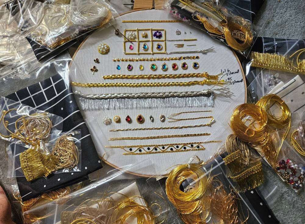A sample kit on black linen made by Ann-Juliette including purl, gilded leather, passing thread, gems, dubka, etc. Embroidery frame and needles not included.
